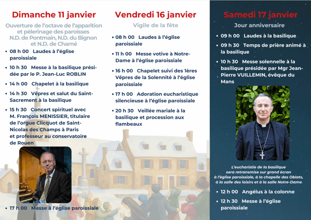 Le sanctuaire dévoile le programme de la semaine, la messe solennelle du 17 janvier sera présidée par Mgr Vuillemin, évêque du Mans.